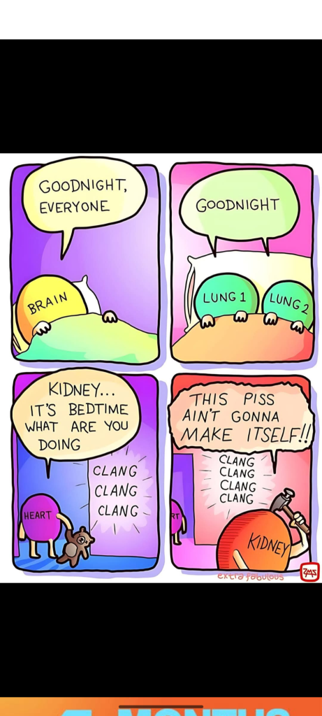 Biologically, it nails a genuine truth: many organs slow down at night while the kidneys keep working tirelessly. Even when you’re asleep, they’re filtering blood, regulating fluids, and making urine. It’s a quiet, ceaseless process — almost like the body’s unsung night-shift worker.